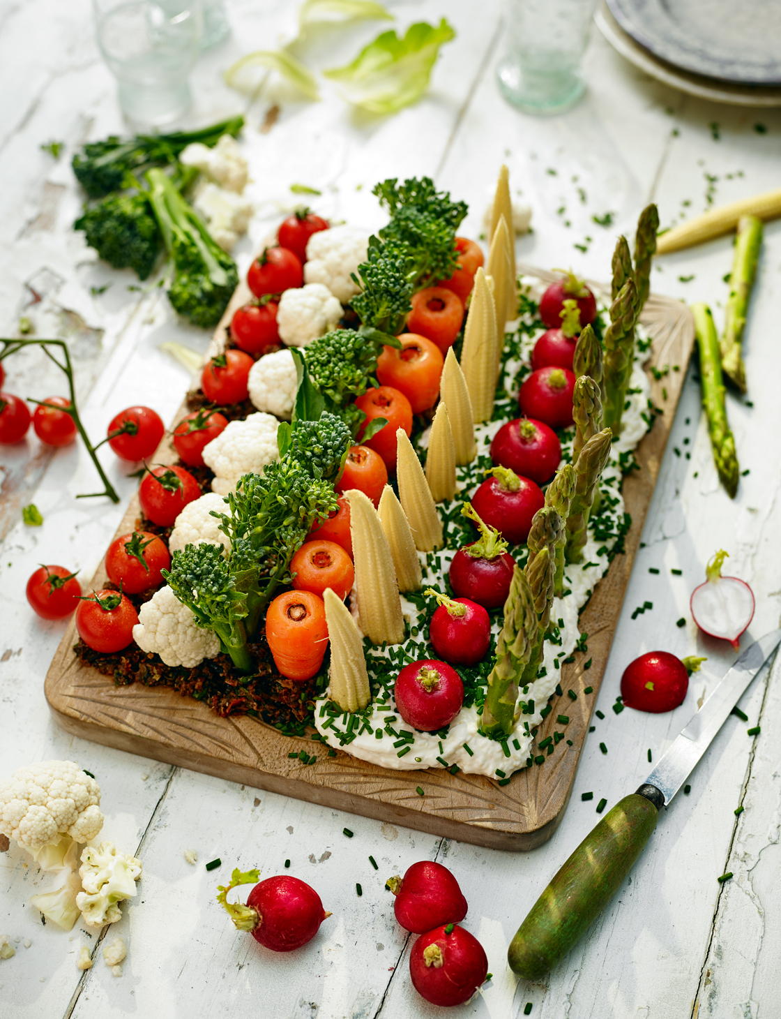Насколько сочетаемы груша с огурцом, я не знаю, но именно из этих продуктов состоит лягушка. А букет из фаршированных брынзой помидор-тюльпанов мог бы украсит и взрослый праздник. Стебельки и листья — из зеленого лука.