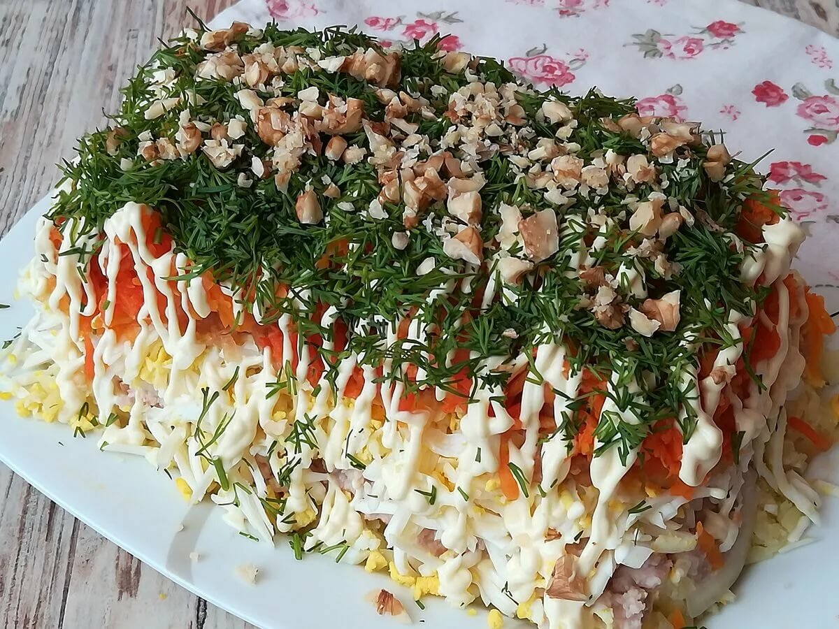 Перед подачей выложить на блюдо, украсить мелко нарубленным грецким орехом и майонезной сеткой.